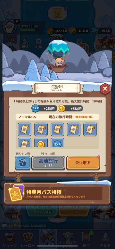 /高速旅行(2時間分の放置報酬)は毎日消化しておきましょう!\