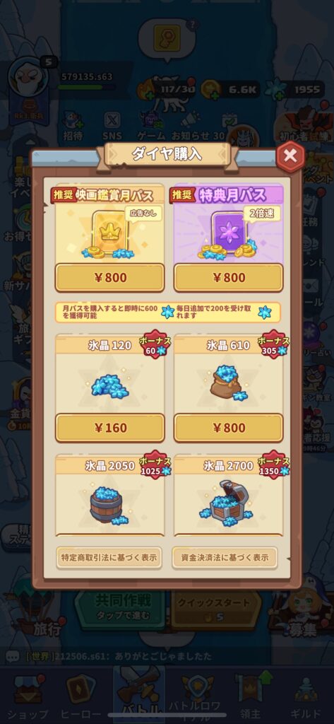 中でも「映画鑑賞月パス(800円)」・「特典月パス(800円)」は、貴重な氷晶を手頃な価格で入手出来るのでおすすめですね(映画鑑賞は広告なし、特典は2倍速とそれぞれ特典が付与されています)。
