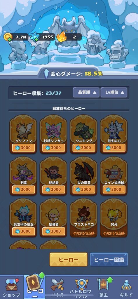 どのヒーローが召喚されるか分からないという運要素の強い斬新なシステムが採用されていて、上振れた時の無双感が楽しいゲームとなっています。といっても、運だけではなくヒーローを育成する要素もあるので、運だけが全てのゲームではありませんね。